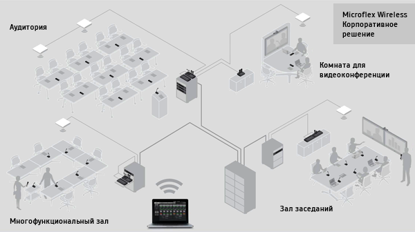Простая в настройке и расширении беспроводная система Microflex™ Wireless легко масштабируется для использования в разноплановых корпоративных залах, объединенных одной сетью. При изменении конфигурации помещения (например, при переносе системы из официального зала заседаний в помещение для аудиовизуальных конференций) беспроводные модульные компоненты могут быть легко трансформированы в соответствии с требованиями к количеству передатчиков новой конфигурации.
