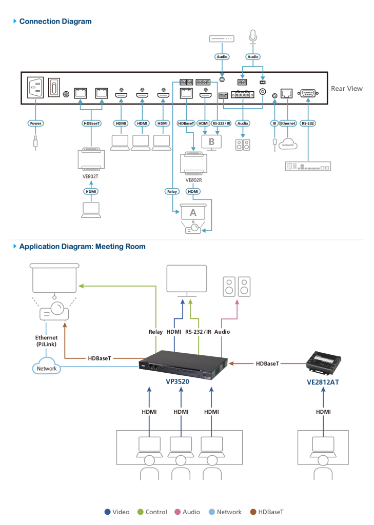 Реализованная в коммутаторе VP3520 функция управления предлагает пользователям несколько вариантов использования, таких как кнопки на передней панели, ИК-пульт дистанционного управления, команды интерфейса RS-232 и работа через веб-интерфейс. Кроме того, коммутатор VP3520 позволяет управлять аудио/видео-устройствами, такими как телевизионные дисплеи, проекторы и мониторы. Он идеально подходит для любых конференц-залов и учебных заведений, включая комнаты для совещаний, классы, учебные залы или другие помещения для проведения презентаций, такие как выставочные галереи или отели.