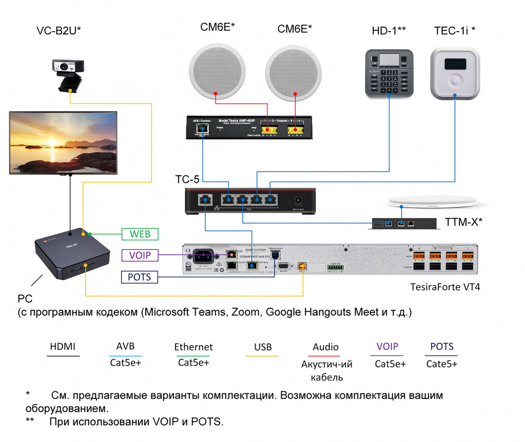 Комплект для оснащения небольшой переговорной комнаты. Позволяет проводить живые и онлайн конференции Microsoft Teams, Zoom, Google Hangouts Meet, с возможностью принимать звонки VOIP.