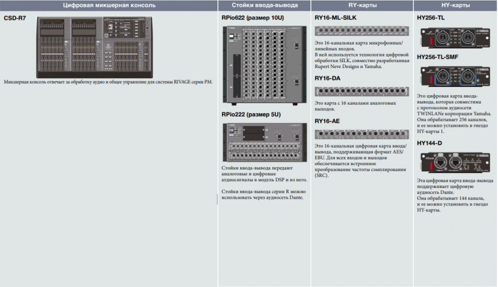 Модуль DSP отвечает за микширование, обработку подключаемыми модулями и другие виды обработки аудио для системы RIVAGE PM7. - Модули ввода-вывода: RPio622 и Rpio222