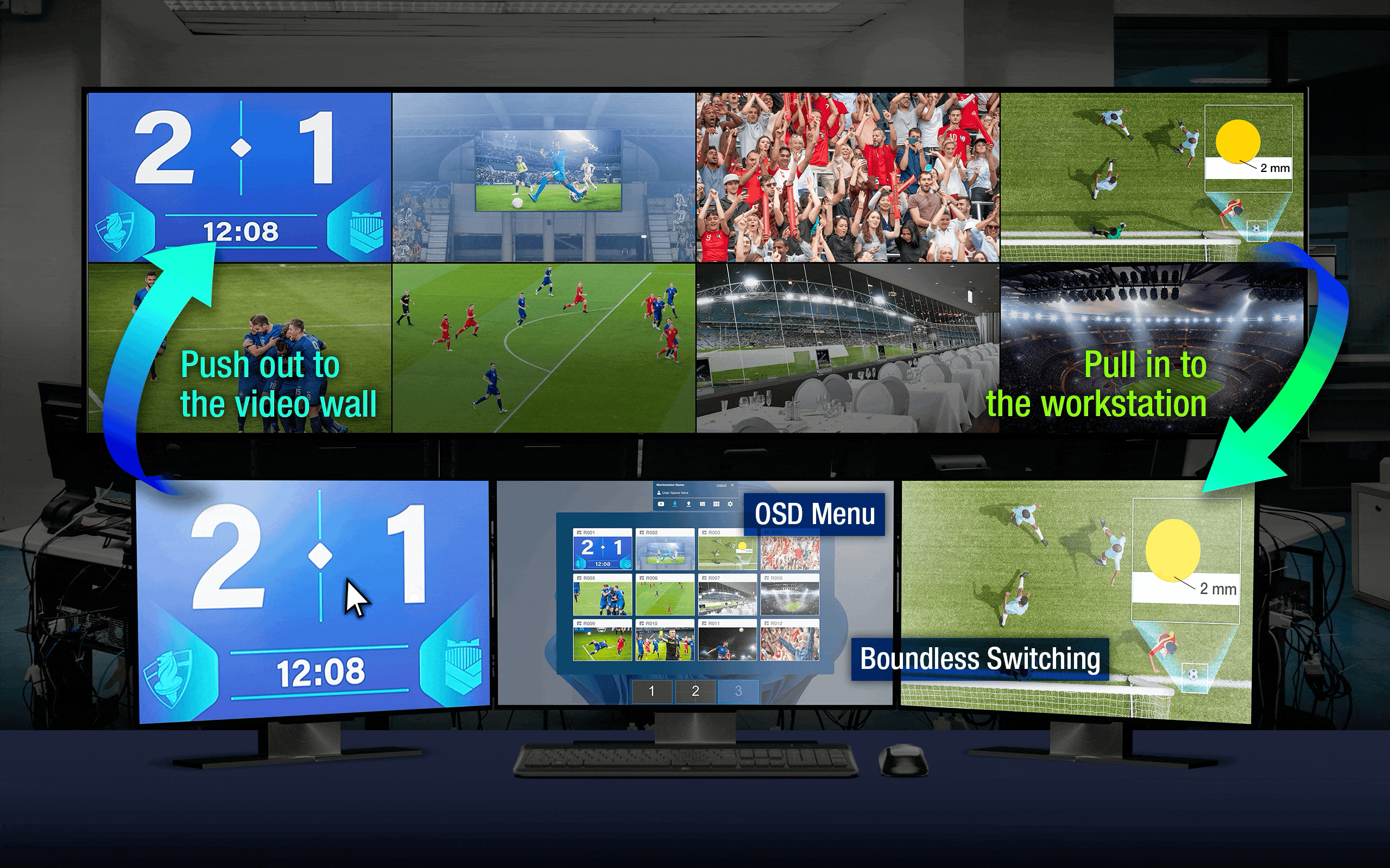 (Функция Boundless Switching позволяет легко переключаться между источниками видеосигнала перемещая курсор мыши по экрану, что повышает уровень осведомленности о ситуации в реальном времени и информированности при принятии решений.)
