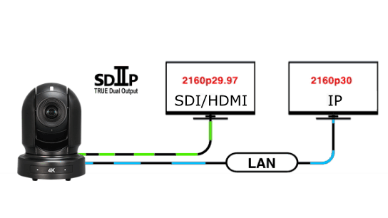 - True Dual Output PTZ-камера (с двумя выходами) обеспечивает одновременную передачу данных 6G/3G-SDI и потоковую передачу 4k видео по IP, а также управление.