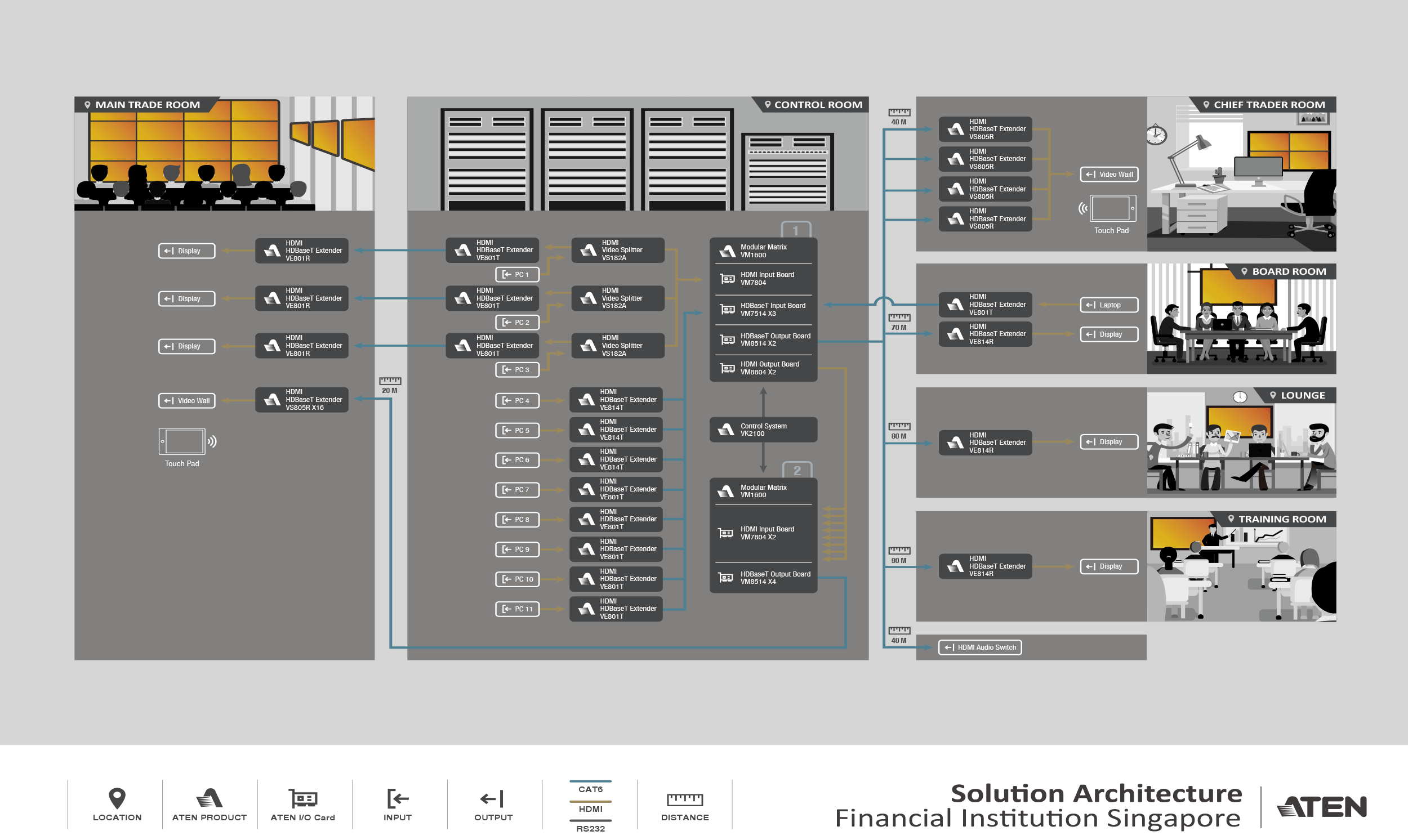 Модульный матричный коммутатор ATEN VM1600 обеспечивает интеграцию HDMI и HDBaseT сигналов с преобразованием форматов и масштабированием в реальном времени. Два центральных коммутатора VM1600 соединяют основную видео стену формата 4x4 (размером примерно 3x1,7 м) с видеостеной 2x2, которая расположена в личном офисе главного трейдера. Эти же коммутаторы используются для подключения всех оставшихся дисплеев в зале заседаний, лаунж-зоне и тренинг-центре. Схема подключена включает один ведомый коммутатор VM1600, который используется для работы главной видео стены 4x4, в то время как основной коммутатор VM1600 разделяет все потоки и перенаправляет 8 каналов на ведомый коммутатор, 4 потока на видео стену 2x2 в кабинете главного трейдера и 3 потока медиаданных для дисплеев в лаунж-зоне, зале заседаний и тренинг-центре. Последний канал на коммутаторе обслуживает общую систему звукоусиления компании. Все видеостены и источники медиа данных используют протокол RS-232, передающийся по Ethernet каналу HDBaseT, что позволяет осуществлять полноценное централизованное управление двумя видеостенами и всеми оставшимися дисплеями.